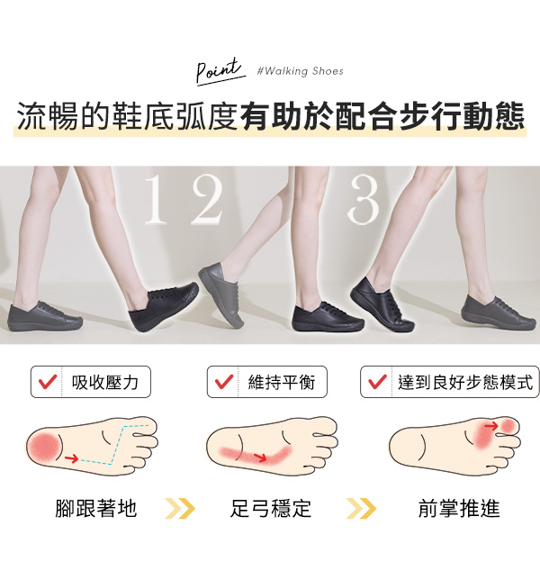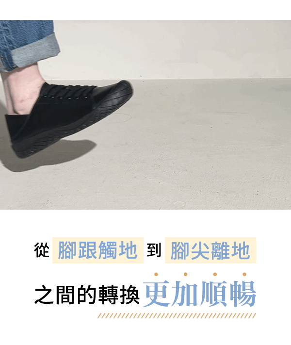 ◎ 流暢的鞋底弧度有助於配合步行動態並引導足部放鬆,進而循環良好步態。