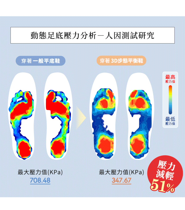◎ 經人因測試實驗與一般平底鞋相比,3D足底平衡鞋的足底動態壓力有效減輕51%。